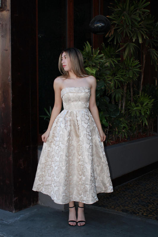 Vestido, beige con dorado, straple con estampado #11647