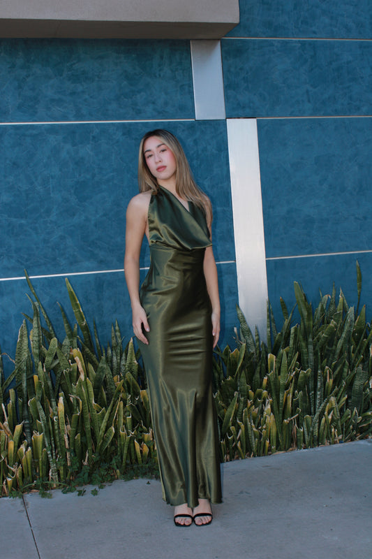 Vestido verde olivo halter de satín #11603