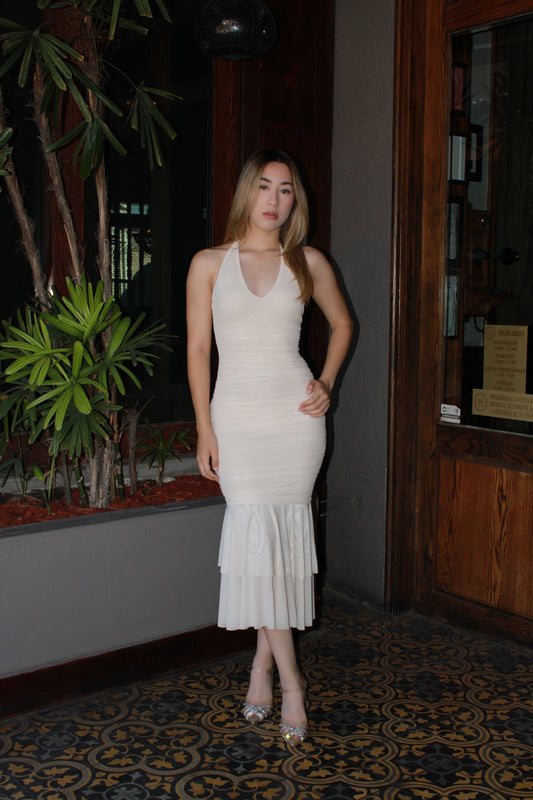 Vestido beige halter corrugado midi #11311