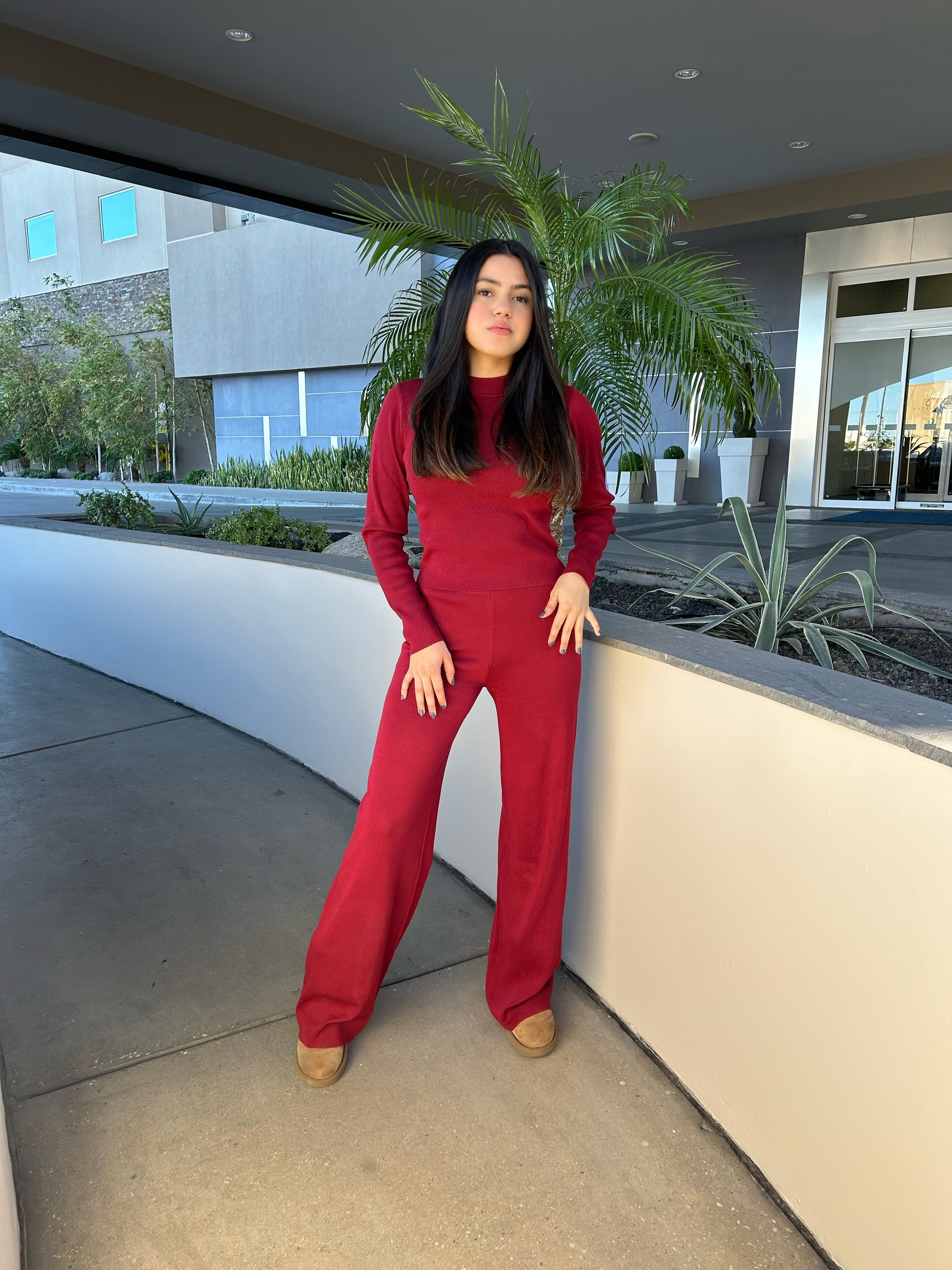 Conjunto de dos piezas blusa de manga larga pantalón con elástico cuello redondo en color vino