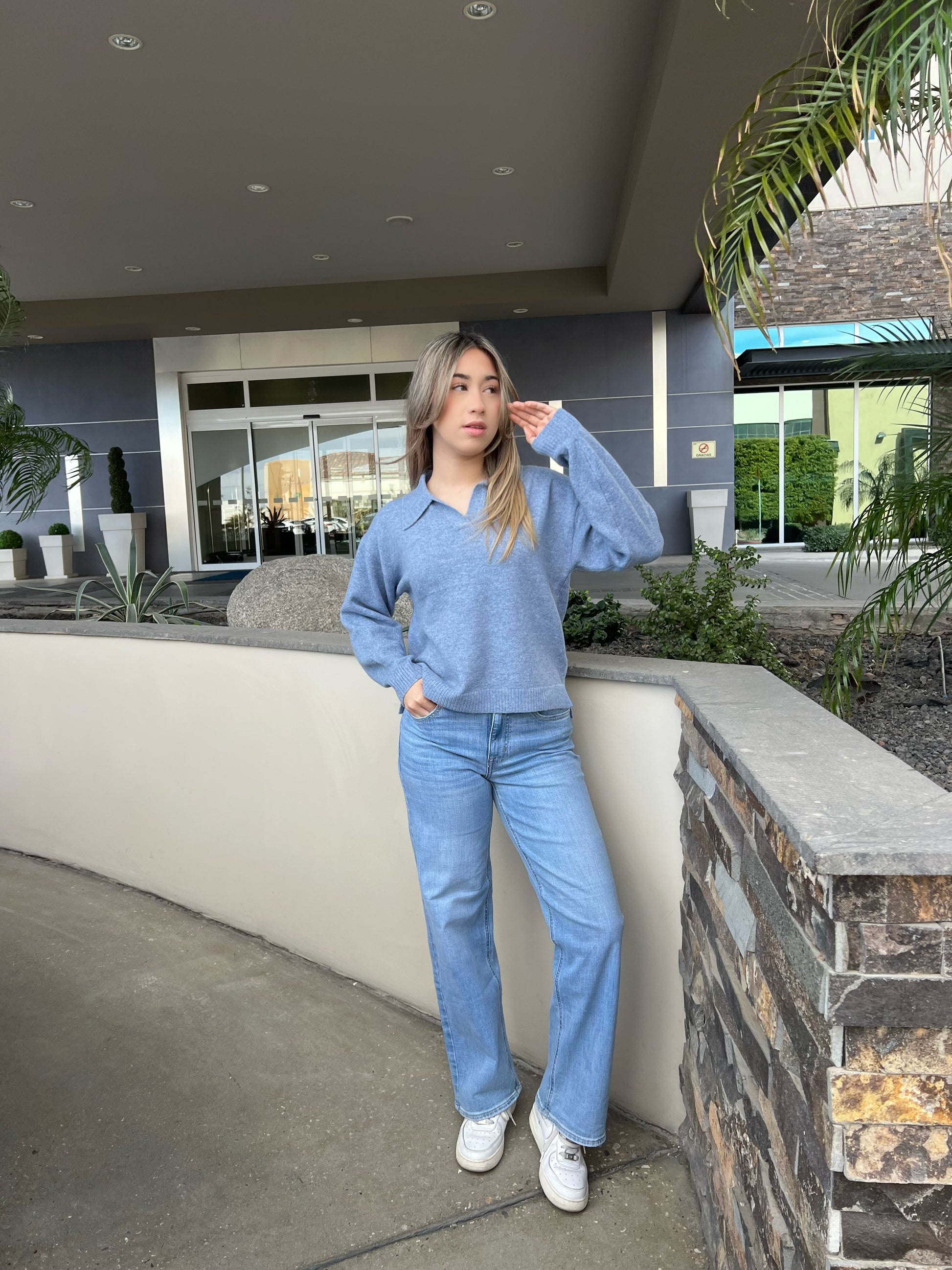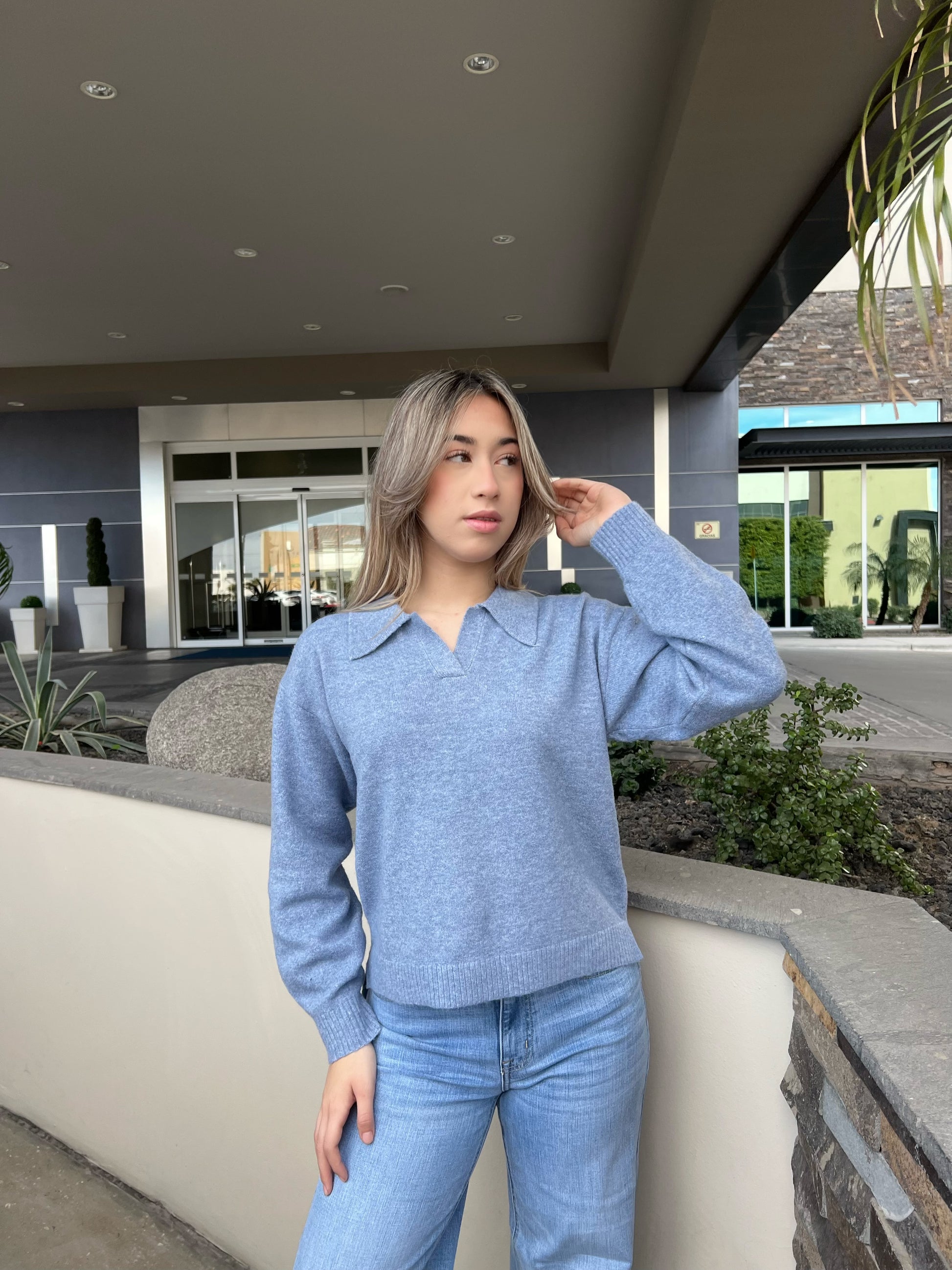 Suéter cuello polo, corte abajo de la cintura, color azul