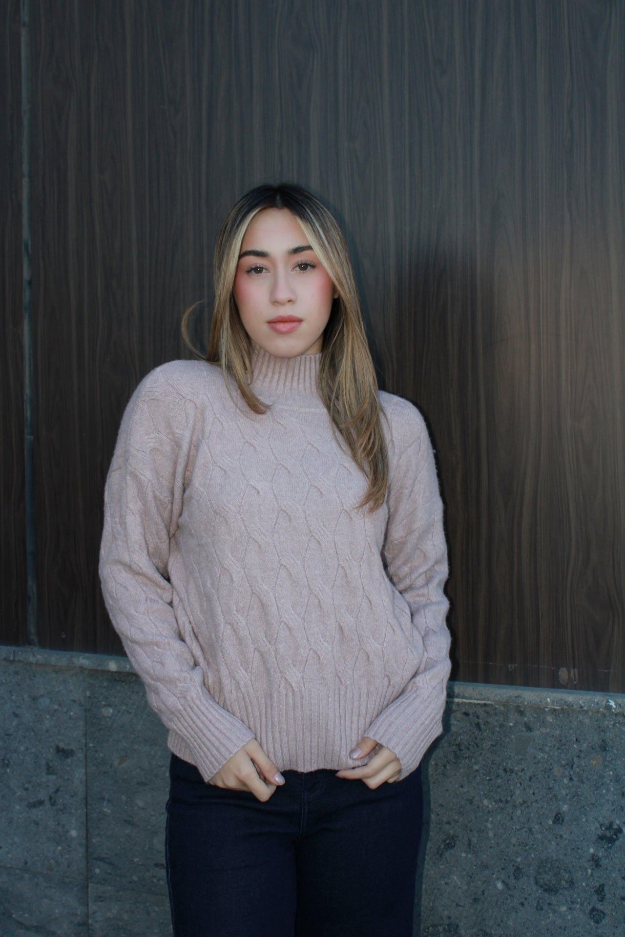 Suéter rosa bajito con cuello largo