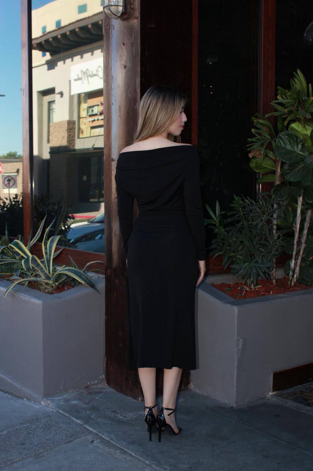 Vestido negro manga larga c metal dorado hombro asimétrico #11621
